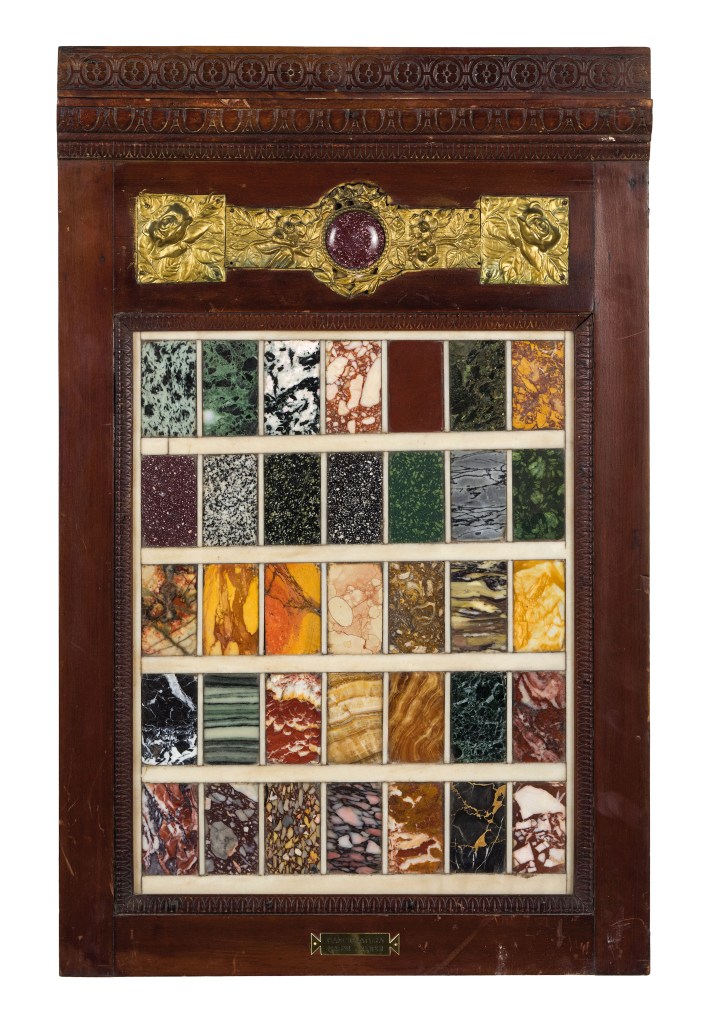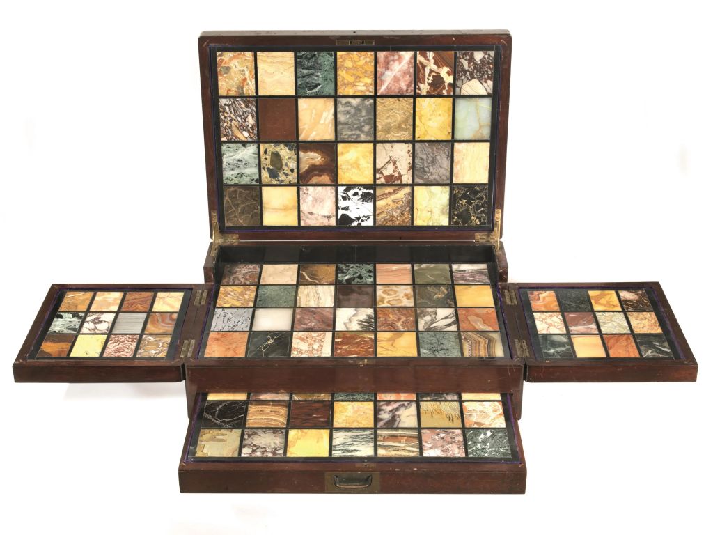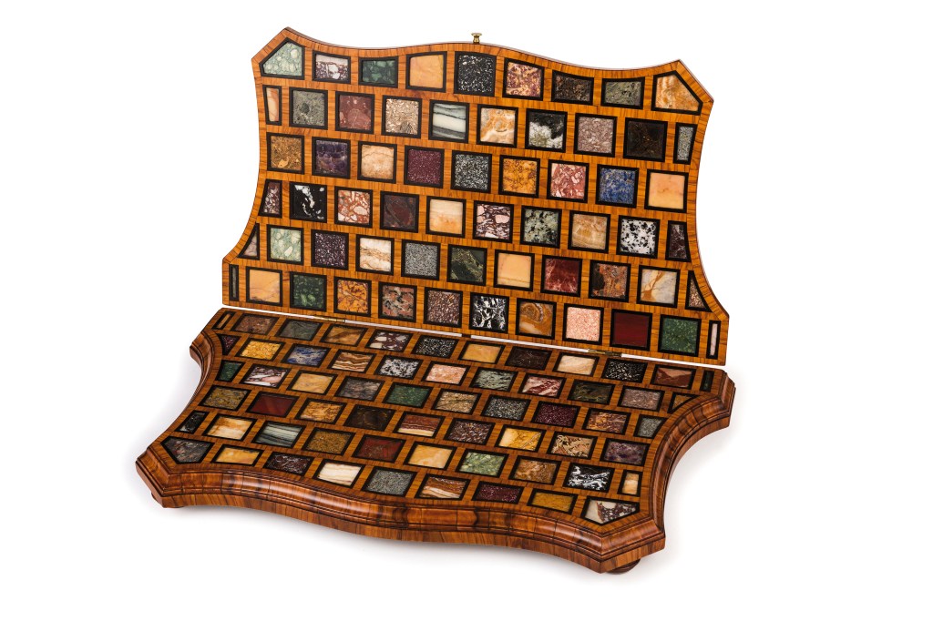 La litoteca, invece, è un curioso strumento di conoscenza, si potrebbe quasi dire didattico. Si tratta di un oggetto di arredamento, realizzato in legno pregiato, all’interno del quale vengono inseriti i campioni di tutti i marmi, o per meglio dire i minerali, conosciuti o richiesti dal committente, ciascuno dei quali presenta la propria nomenclatura in corrispondenza della sua posizione. Il suo intento primario è, chiaramente, quello collezionistico, infatti la Collectio Marmorum, così come citata in alcuni documenti, fu un oggetto molto ambito da parte di nobili e, soprattutto, alti prelati in particolare a partire dal XVIII secolo. Rintracciare questi preziosi manufatti sul mercato dell’arte è abbastanza facile, ma sicuramente dispendioso. Se però se ne vuole ammirare un esemplare di notevole qualità ed eleganza si può arrivare a Ferrara, nel Museo di Palazzo Schifanoia, dove si conserva la Litoteca del Riminaldi, gioiello uscito dalle sapienti mani di una bottega romana del Settecento.